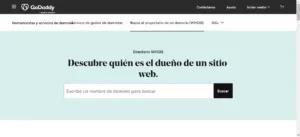 GoDaddy, uno de los registradores de dominios más grandes del mundo, ofrece su propia herramienta de búsqueda WHOIS en su sitio web. Es una opción conveniente si tienes dominios registrados con GoDaddy o si deseas obtener información sobre dominios que podrían estar alojados con este registrador.